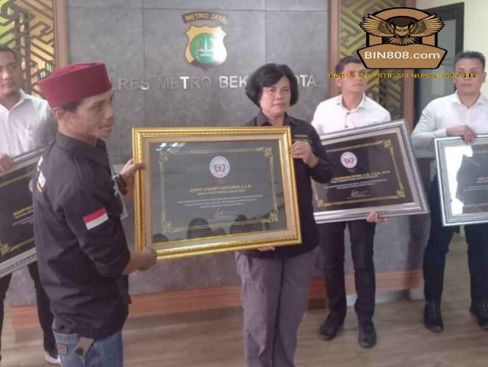 BEKASI KOTA- BIN808.COM || Penyematan 6 piagam apresiasi FWJ Indonesia langsung diterima jajaran Kepolisian Polres Metro Bekasi Kota. Dalam penyerahan piagam itu, Kasi Humas Polres Metro Bekasi Kota Kompol Erna Ruswing Andari yang didampingi, Kasat Reskrim, Kanit Krimsus dan penyidik diterima dengan baik.