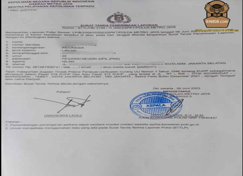 Jakarta- BIN808.com || Pegawai Negeri Sipil (PNS) Dinas Perhubungan (Dishub) DKI Jakarta WS Laoli melaporkan HR (Hariyati) oknum PNS BKD Walikota Jakarta Selatan ke Polda Metro Jaya yang diduga telah menipu 18 calon KKI atau PJLP dengan nilai diatas 1 Miliar rupiah.