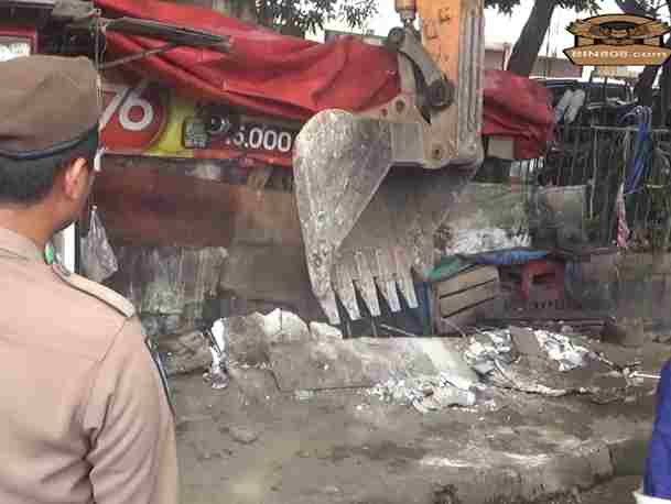 Satu unit alat berat dikerahkan untuk membantu petugas membongkar bangunan semi permanen yang menjadi bagian dari lapak PKL yang berada di atas saluran air.